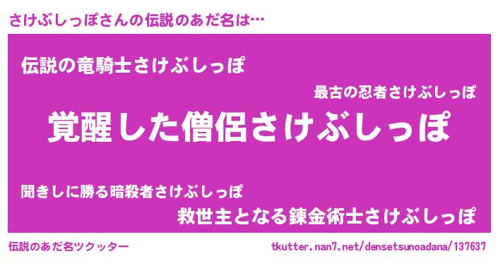 | 男性向けラノベタイトル風あだ名 | 『さけぶしっぽ~年齢イコール彼女いない歴の魔法使い~』 |