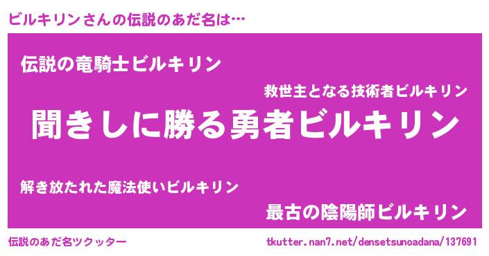 | 男性向けラノベタイトル風あだ名 | 『ビルキリンという概念が存在しない退屈な世界 』 |