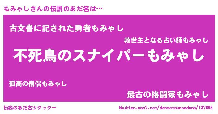 | 女子向けラノベタイトル風あだ名 | 『もみゃし姫と円卓の騎士』 |