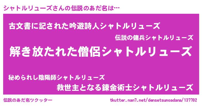 | ヒーロー風カッコイイあだ名 | 『幻影騎士シャ』『ネオシャトルリューズ』 |