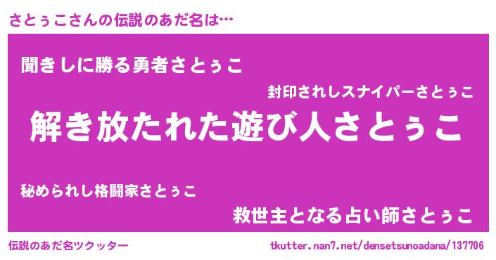 | 男性向けラノベタイトル風あだ名 | 『この素晴らしい世界にさとぅこを!』 |