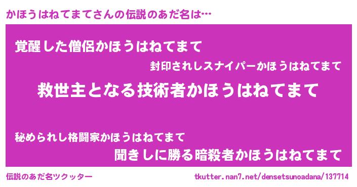 | 男性向けラノベタイトル風あだ名 | 『かほうはねてまてに滅ぼされるだけの簡単なお仕事です』 |