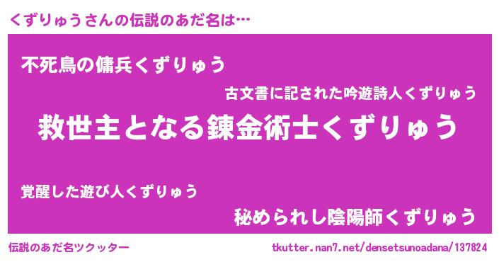 | 女子向けラノベタイトル風あだ名 | 『死神くずりゅうの再婚』 |