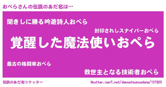 | 男性向けラノベタイトル風あだ名 | 『おぺら~年齢イコール彼女いない歴の魔法使い~』 |
