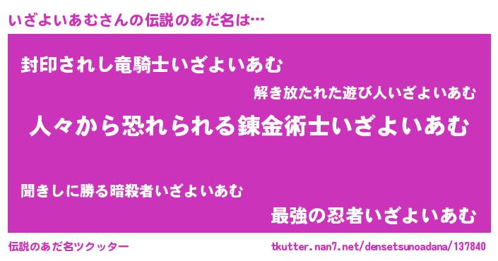 | 男性向けラノベタイトル風あだ名 | 『おまえをオタクにしてやるから、俺をいざよいあむにしてくれ! 』 |