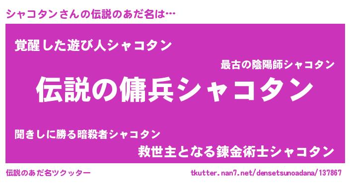 | ヒーロー風カッコイイあだ名 | 『スーパーシャコタン』『魔戒騎士シャ』 |