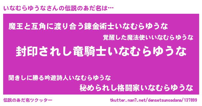 | 男性向けラノベタイトル風あだ名 | 『イナムラユウナアートオンライン』 |