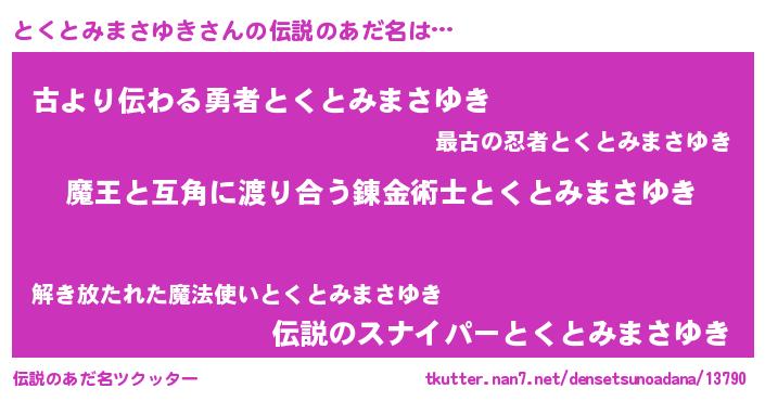 | ヒーロー風カッコイイあだ名 | 『仮面トクダー』『ネオトクトミマサユキ』 |
