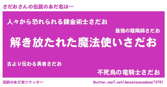 | ヒーロー風カッコイイあだ名 | 『魔戒騎士サダ』『最強戦士サダオ』 |