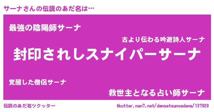 | 男性向けラノベタイトル風あだ名 | 『うちのサーナが世界を掌握している!』 |