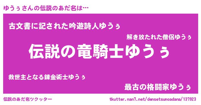 男性向けラノベタイトル風あだ名 | 『ゆうぅの憂鬱』『ユウゥスレイヤー』 |