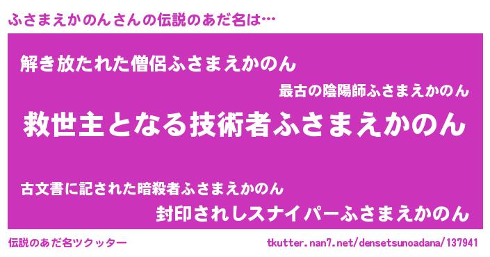 | 男性向けラノベタイトル風あだ名 | 『この素晴らしい世界にふさまえかのんを!』 |