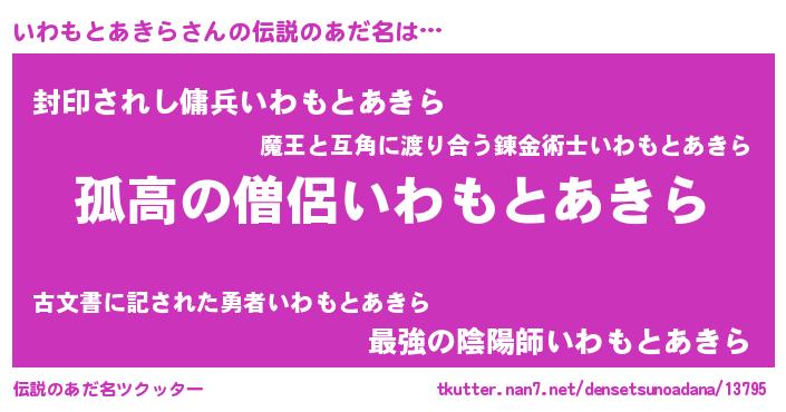 | 男性向けラノベタイトル風あだ名 | 『ダンジョンにいわもとあきらを求めるのは間違っているだろうか』 |
