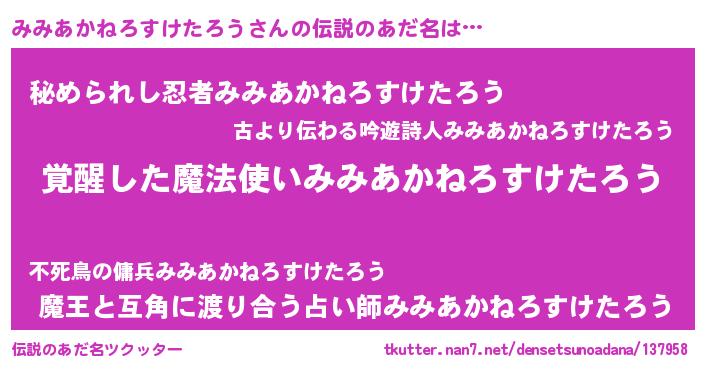| 男性向けラノベタイトル風あだ名 | 『みみあかねろすけたろうの嫁は女の子じゃないと思った?』 |