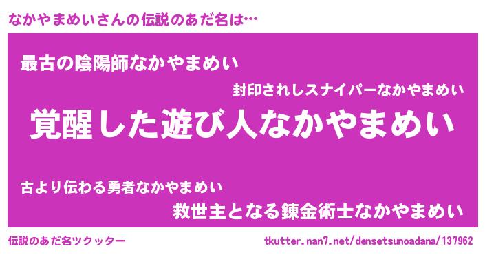 | 男性向けラノベタイトル風あだ名 | 『なかやまめいの嫁は女の子じゃないと思った?』 |