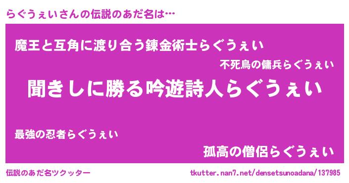 | ヒーロー風カッコイイあだ名 | 『ネオラグウェイ』『究極戦士ラグウェイ』 |