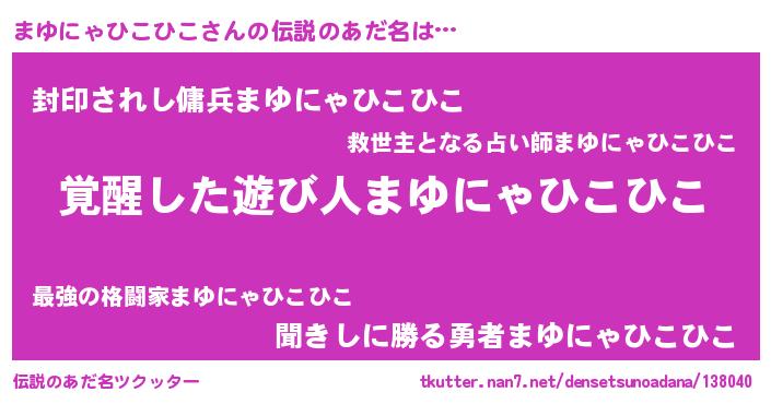 | 男性向けラノベタイトル風あだ名 | 『Re:まゆにゃひこひこから始める異世界生活』 |