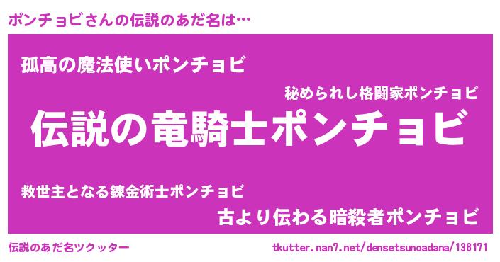 | 男性向けラノベタイトル風あだ名 | 『ポンチョビの憂鬱』 |