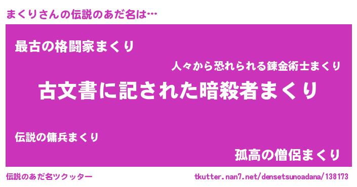 | 男性向けラノベタイトル風あだ名 | 『この素晴らしい世界にまくりを!』 |