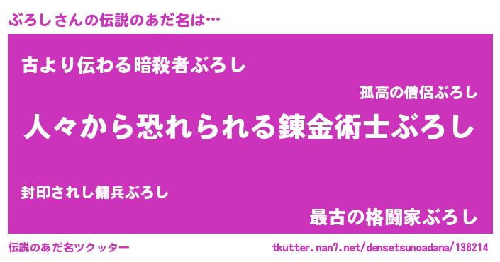 | 女子向けラノベタイトル風あだ名 | 『ぶろし夫妻のなれそめ』『闇のぶろし』 |