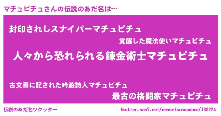 | 男性向けラノベタイトル風あだ名 | 『魔弾の王とマチュピチュ』 |
