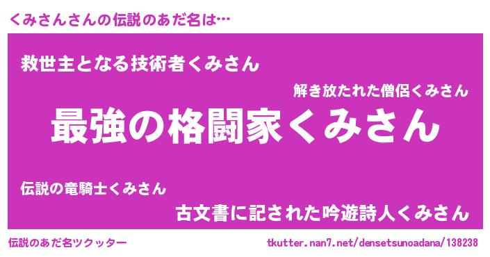 | 男性向けラノベタイトル風あだ名 | 『Re:くみさんから始める異世界生活』 |