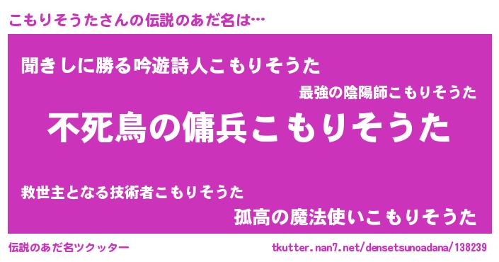 | 男性向けラノベタイトル風あだ名 | 『コモリソウタアートオンライン』 |