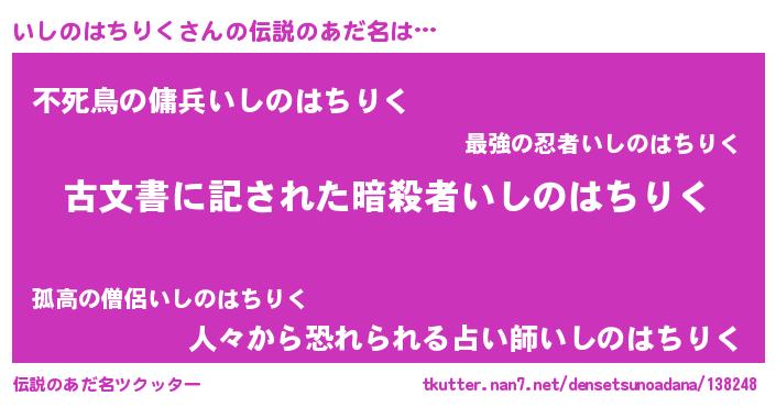 | 男性向けラノベタイトル風あだ名 | 『いしのはちりく~年齢イコール彼女いない歴の魔法使い~』 |