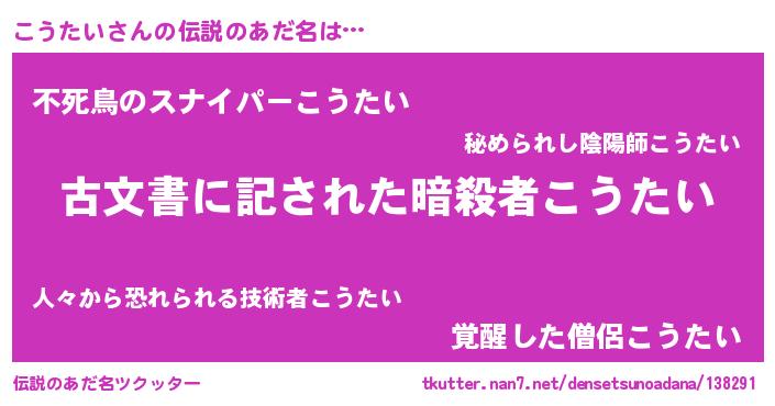 | 胡散臭い通販商品みたいなあだ名 | 『あなたにだけ特別に提供する限定10本のレアな日本酒…その名も「こうたい」』 |