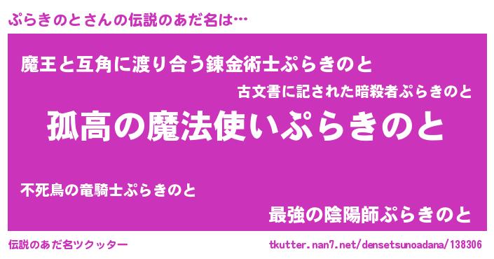 | ヒーロー風カッコイイあだ名 | 『黄金騎士プラ』『正義の使者ぷらきのと』 |