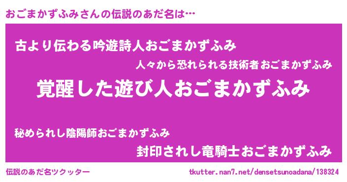 | 男性向けラノベタイトル風あだ名 | 『おごまかずふみ~年齢イコール彼女いない歴の魔法使い~』 |