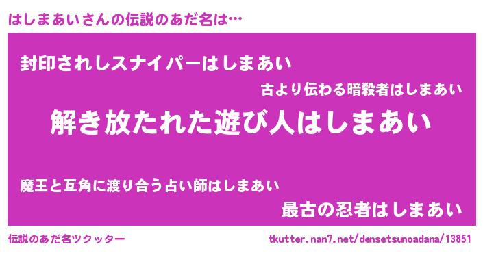| ヒーロー風カッコイイあだ名 | 『ウルトラ戦士ハシマアイ』 |