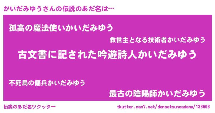 | ヘコむあだ名 | 『かいだみゆう(小並感)』『かいお』 |