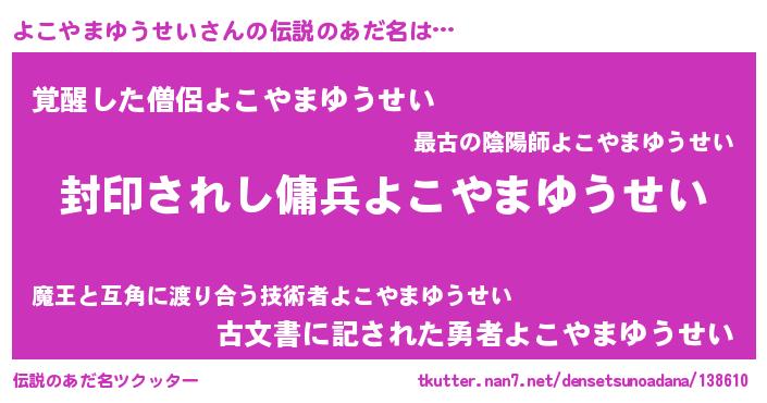 | 男性向けラノベタイトル風あだ名 | 『よこやまゆうせいに滅ぼされるだけの簡単なお仕事です』 |