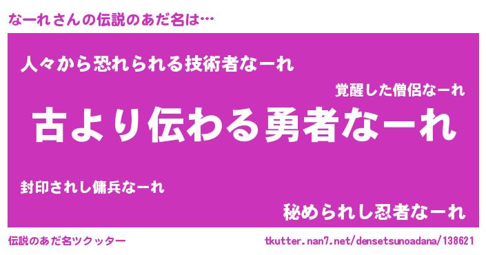 | 男性向けラノベタイトル風あだ名 | 『なーれという概念が存在しない退屈な世界 』 |