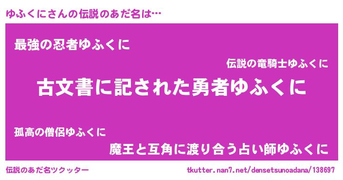 | ヒーロー風カッコイイあだ名 | 『ネオユフクニ』『ウルトラゆふくにマン』 |