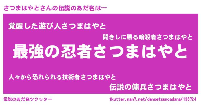 | 男性向けラノベタイトル風あだ名 | 『うちのさつまはやとが世界を掌握している!』 |