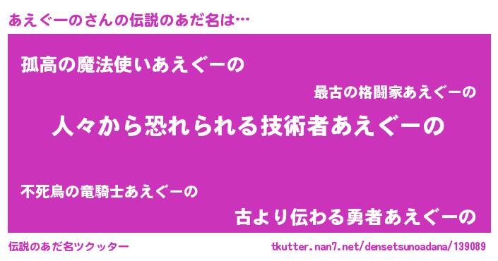 | ヒーロー風カッコイイあだ名 | 『仮面アエダー』『正義の使者あえぐーの』 |