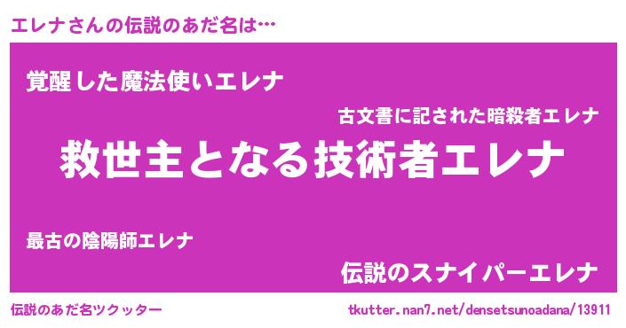 | 男性向けラノベタイトル風あだ名 | 『エレナに滅ぼされるだけの簡単なお仕事です』 |