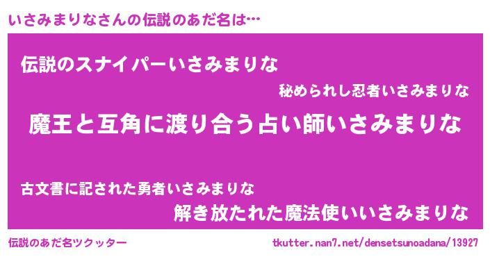 | 男性向けラノベタイトル風あだ名 | 『この素晴らしい世界にいさみまりなを!』 |
