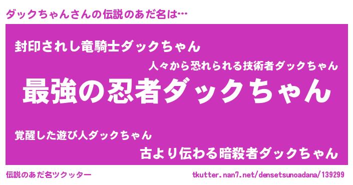 | 男性向けラノベタイトル風あだ名 | 『この素晴らしい世界にダックちゃんを!』 |