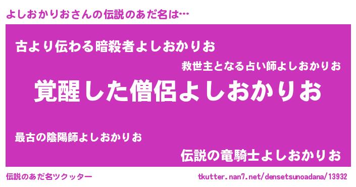 | 男性向けラノベタイトル風あだ名 | 『よしおかりおの嫁は女の子じゃないと思った?』 |