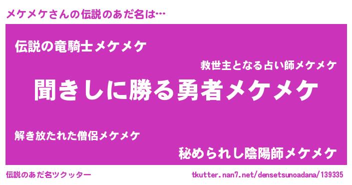 | 男性向けラノベタイトル風あだ名 | 『メケメケという概念が存在しない退屈な世界 』 |