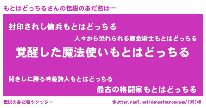 | 男性向けラノベタイトル風あだ名 | 『もとはどっちる~年齢イコール彼女いない歴の魔法使い~』 |