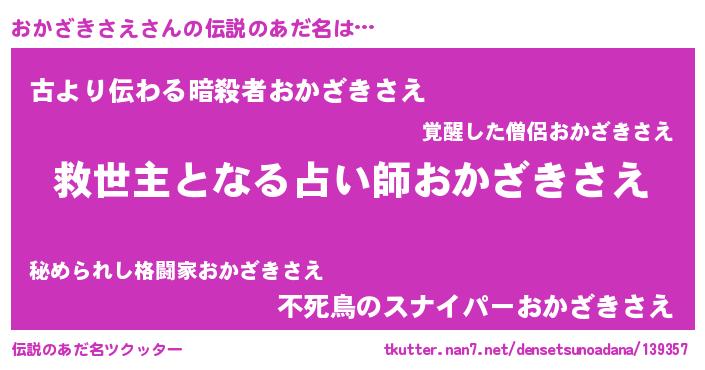 | 男性向けラノベタイトル風あだ名 | 『おかざきさえに滅ぼされるだけの簡単なお仕事です』 |