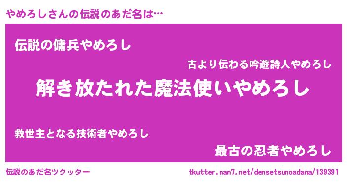 | ヒーロー風カッコイイあだ名 | 『魔戒騎士ヤメ』『究極戦士ヤメロシ』 |