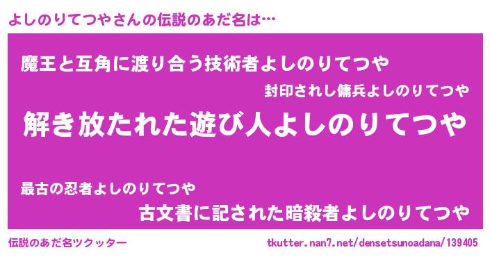 | ポケモン風あだ名 | 『ヒヨシノリテツヤ』『ヨシゴンZ』 |