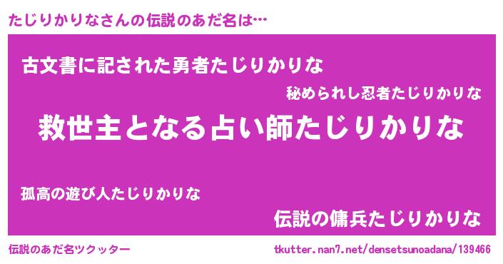 | ヒーロー風カッコイイあだ名 | 『慈愛の使者たじりかりな』 |
