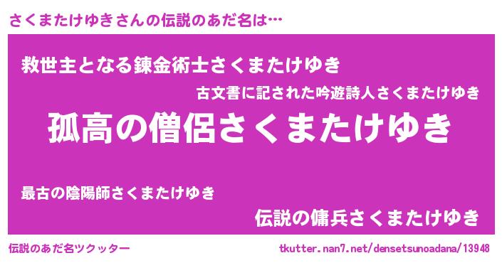 | 男性向けラノベタイトル風あだ名 | 『ダンジョンにさくまたけゆきを求めるのは間違っているだろうか』 |