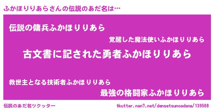 | ヒーロー風カッコイイあだ名 | 『ネオフカホリリアラ』『仮面フカダー』 |